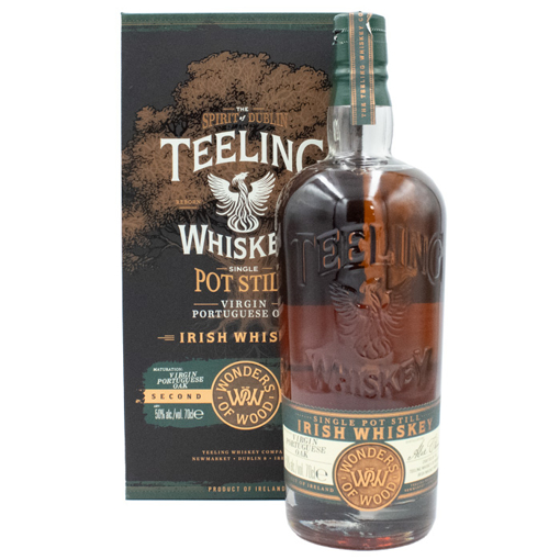 Teeling Wonders of Wood #2 is a limited edition Irish single pot still whiskey, fully matured in virgin Portuguese oak casks. This rare wood imparts rich, spicy flavors with notes of toasted oak, dark chocolate, and warm baking spices, complementing the whiskey's creamy texture and fruit-forward profile.